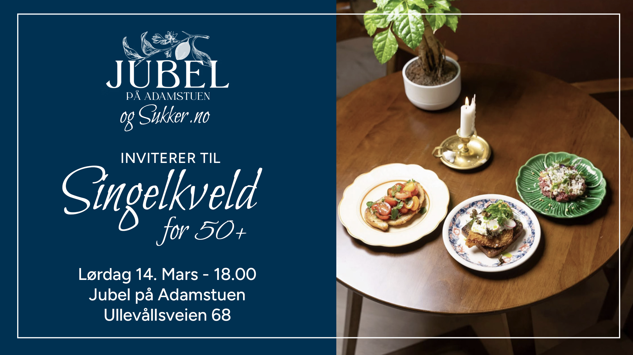 Er du singel og nysgjerrig på å møte nye mennesker i en uformell og hyggelig setting? Sukker.no inviterer deg til en stemningsfull singelkveld for 50+ i hyggelige omgivelser på Adamstuen! Til de som ønsker kan ta seg en matbit - Jubel byr på fristende småretter laget av lokale råvarer.